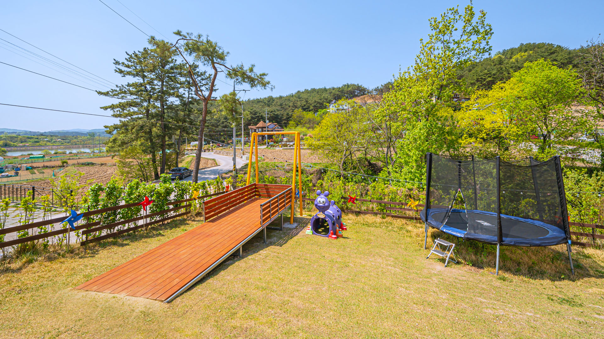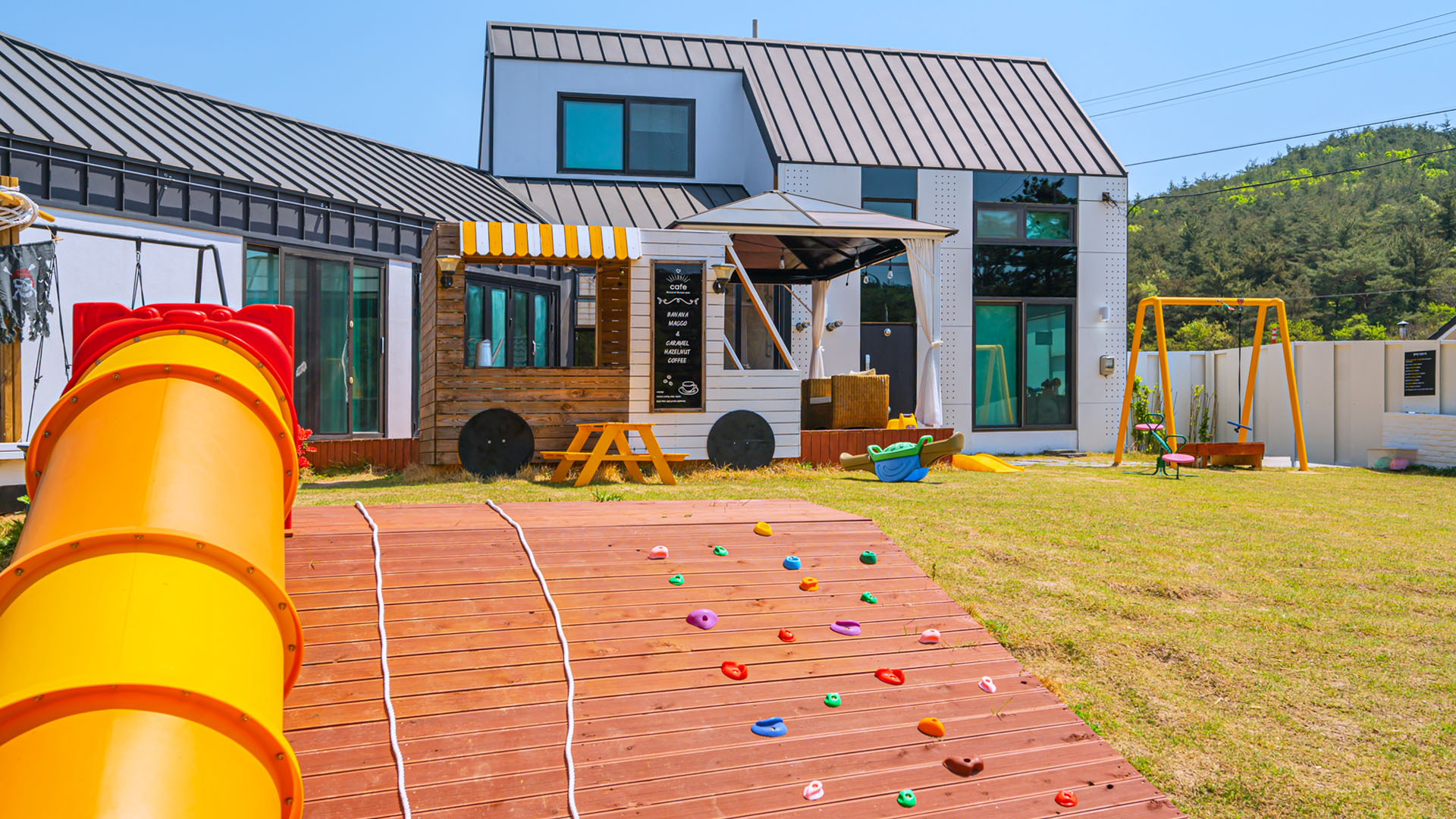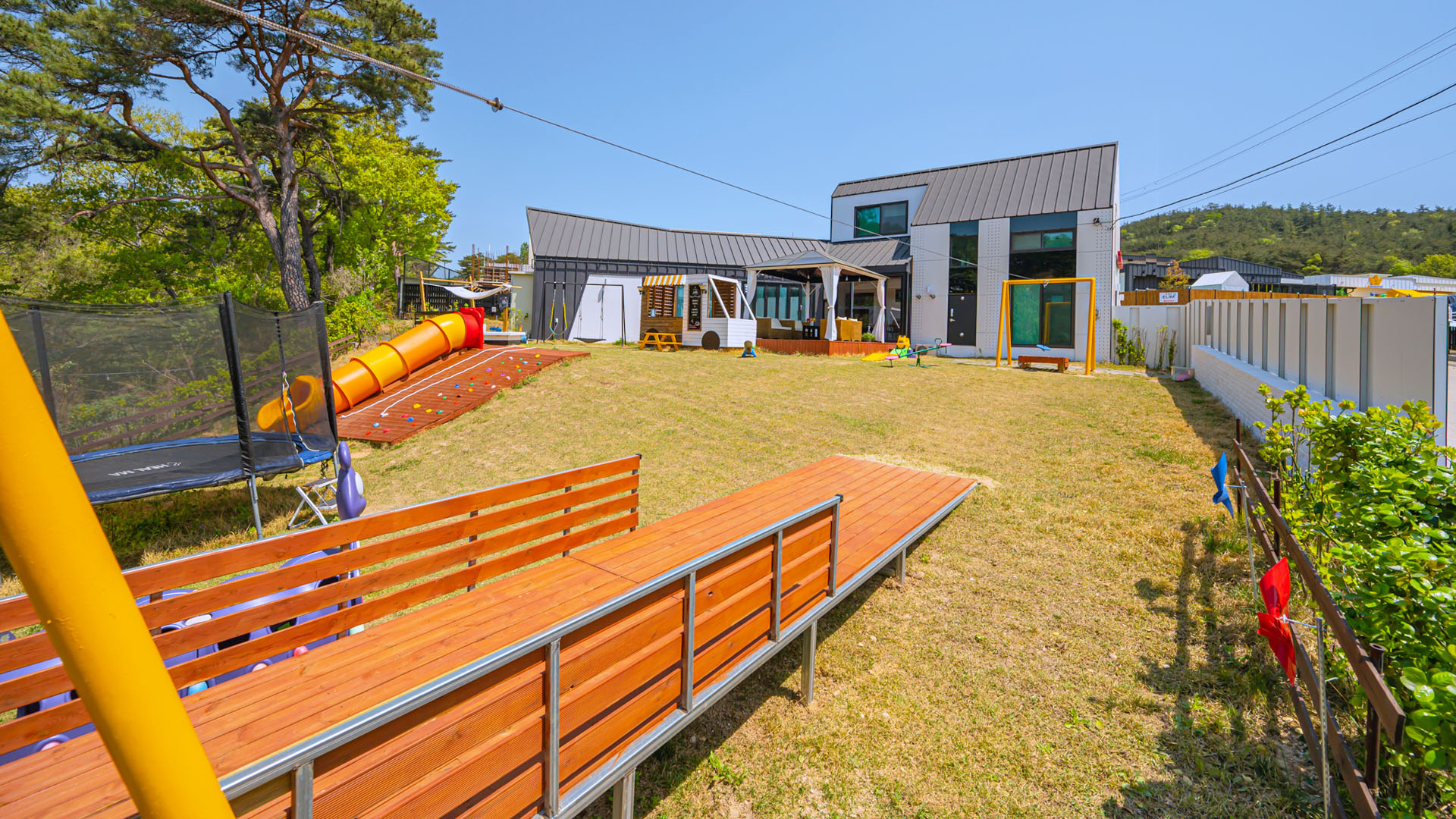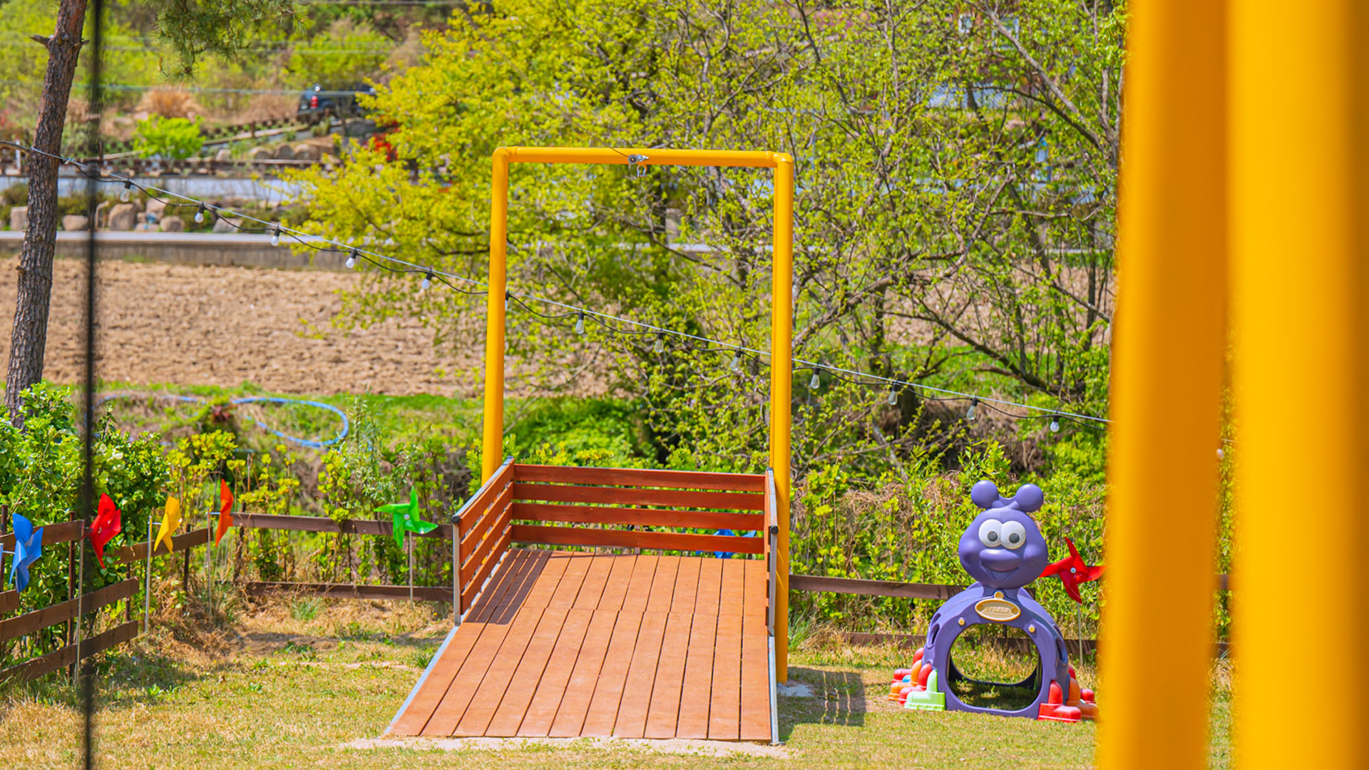 *야외놀이시설 : 17M짚라인, 4.5M대형미끄럼틀, 시소, 그네, 클라이밍, 트렘폴린, 해적선 모래놀이, 유아롤러코스터, 키즈하우스 등